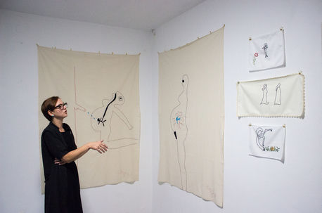 The works span a range of media and approaches: Vuk Palibrk’s black-and-white comics bring a dose of dry humor to the strains of early fatherhood, revealing its parallels with maternal experience; Marija Todorović’s encaustic paintings, developed as part of psychotherapeutic and occupational therapy work during a period of severe postpartum depression, layer wax and pigment into abstract records of psychological states; Milena Gajić’s digital drawings interrogate the tension between motherhood, artistic identity, and the invisibility of domestic labor; Saša Bezjak’s embroidery on everyday textiles maps familial relationships and microstructures of care from a feminist perspective; and Mia Arsenijević’s printed and hand-embroidered friezes weave together memories of childhood with present-day experiences of motherhood, using embroidery as both a symbol of women’s work and a tool for personal narrative.
